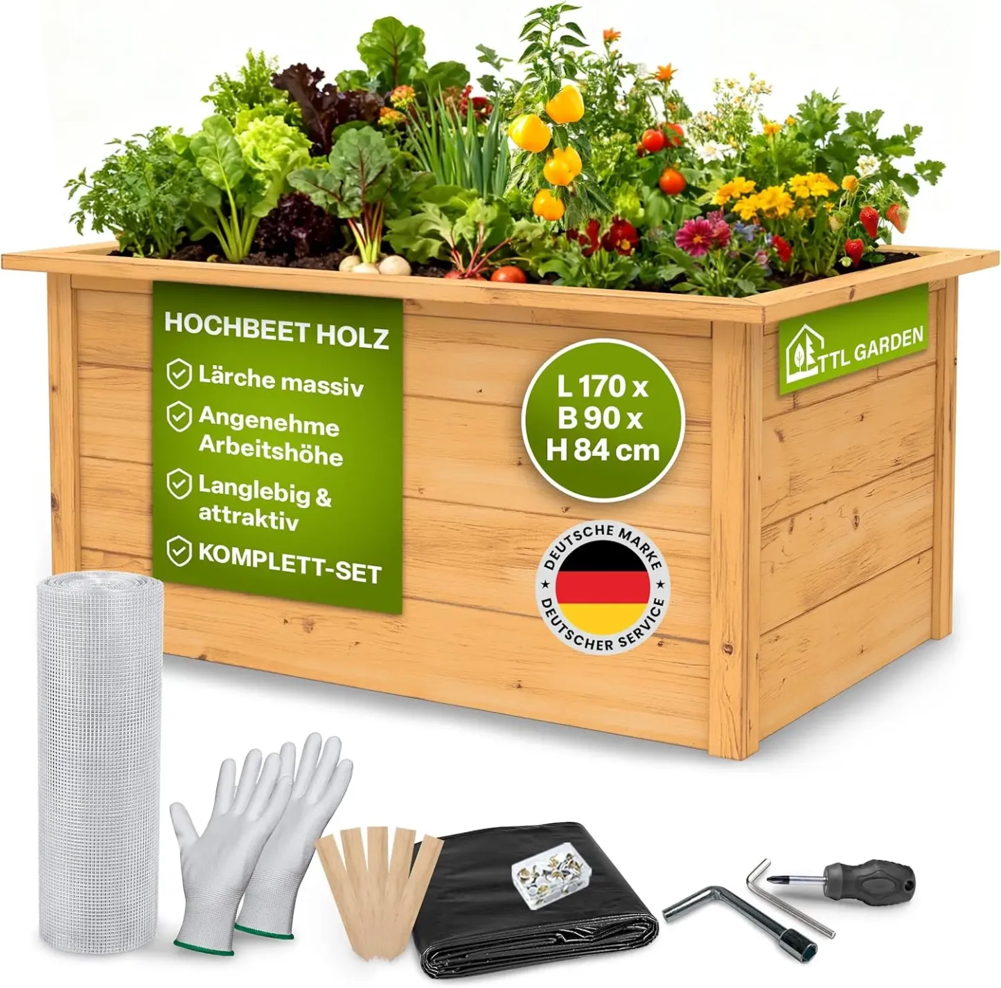 Großes Lärchen-Hochbeet Set 170x90x84cm für Kräuter & Gemüse, wetterbeständig mit Wühlmausgitter