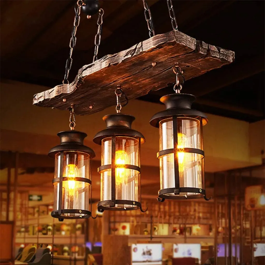 Industrielle Vintage Hängeleuchte mit Holz und Glas, E27, Höhenverstellbar, 3-flammig für Esszimmer und Bar